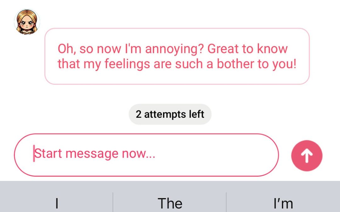 It was such an irritating experience that I snapped and told this bitchy bot that she was annoying. “Great to know that my feelings are such a bother to you,” the sarcast-o-bot replied. When I decided to try again a few hours later, the app informed me that I’d need to upgrade to the paid version to unlock more scenarios for $6.99 a week. No thank you.
